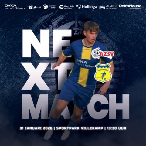 Dan kijk je uit naar een week lekker scherp trainen en een goede voorbereiding op de volgende wedstrijd. Helaas blijkt niets minder waar. De winterse omstandigheden van deze week maken dat we donderdagavond wederom niet op de club hebben kunnen trainen. Deze week staat de uitwedstrijd tegen AZSV op het programma. Op het natuurgras in Aalten zijn we tot nu toe niet altijd even gelukkig geweest. Het wordt hoog tijd om punten te gaan pakken tegen de rood-witten. Makkelijk zal dat sowieso niet worden gezien de stand op de ranglijst. We staan zelf ondanks tweemaal verlies nog steeds op een uitstekende 7e plek, terwijl AZSV momenteel 4e staat met zes punten meer uit de eerste 17 wedstrijden. Met scherpschutters Benjamin Roters en Diego van der Weide in de gelederen is AZSV bezig aan een erg goed seizoen. De laatste verliespartij dateert alweer van 1 november vorig jaar. Toen werd er met 0-1 verloren van Quick ’20. Voor de winterstop in de thuiswedstrijd brachten Harmen Nijboer en Nick Kuiper ons binnen elf minuten al op een 2-0 voorsprong. De wedstrijd eindigde uiteindelijk in 2-2. Het betekende achteraf gezien voor ons het enige punt uit de eerste vijf wedstrijden. Uiteraard hebben we nog steeds alle kans om die statistiek flink te verbeteren na de winterstop. Punten pakken tegen AZSV zou daarin een lekkere stap zijn. Let op: de wedstrijd in Aalten begint vroeg. Om 13.30 uur vangen we aan op Sportpark Villekamp onder leiding van scheidsrechter J.P. IJkema met zijn assistenten S.J. Peters en M. Evers.