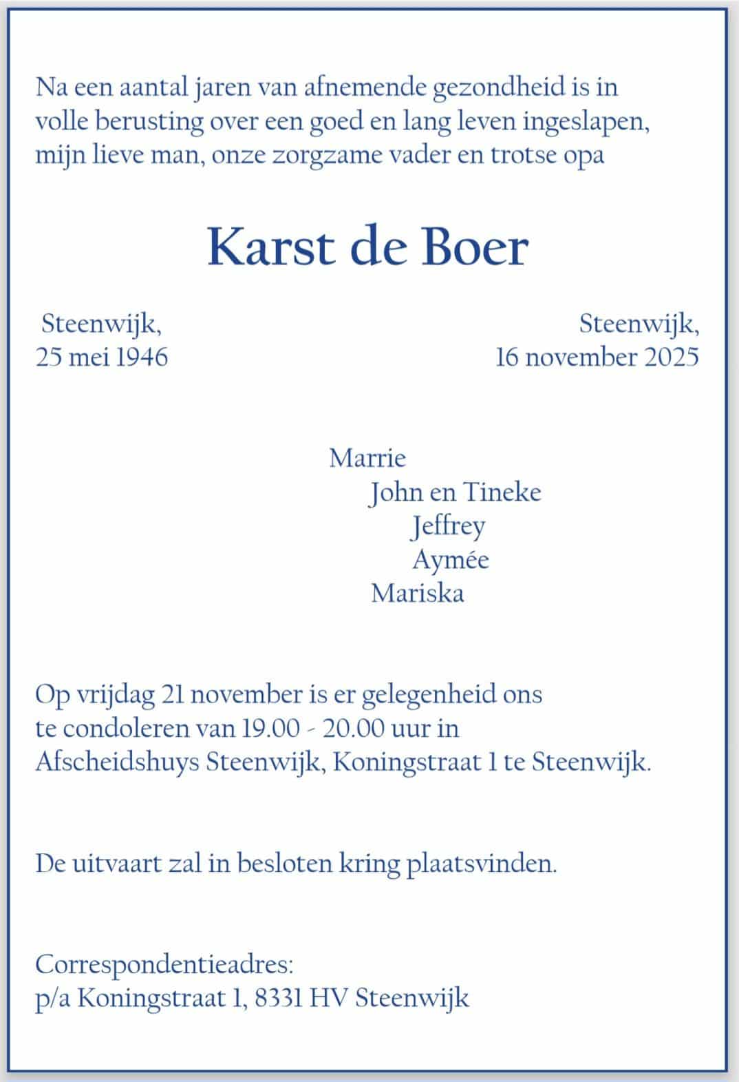 Na een aantal jaren van afnemende gezondheid is Karst de Boer op zondag 16 november ingeslapen.