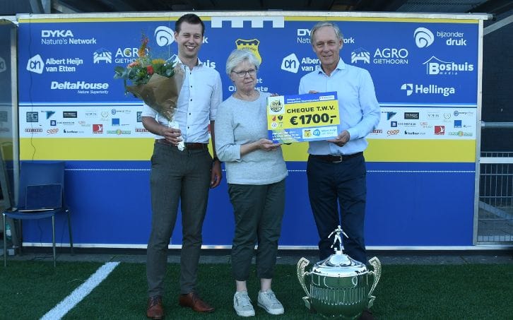 Een mooi gebaar na afloop van de Steenwijker Toren Cup bij Olde Veste deze week. De hoofdsponsor van het toernooi, Albert Heijn Van Etten, heeft in samenwerking met de voetbalclub 1700 euro geschonken aan de Voedselbank.