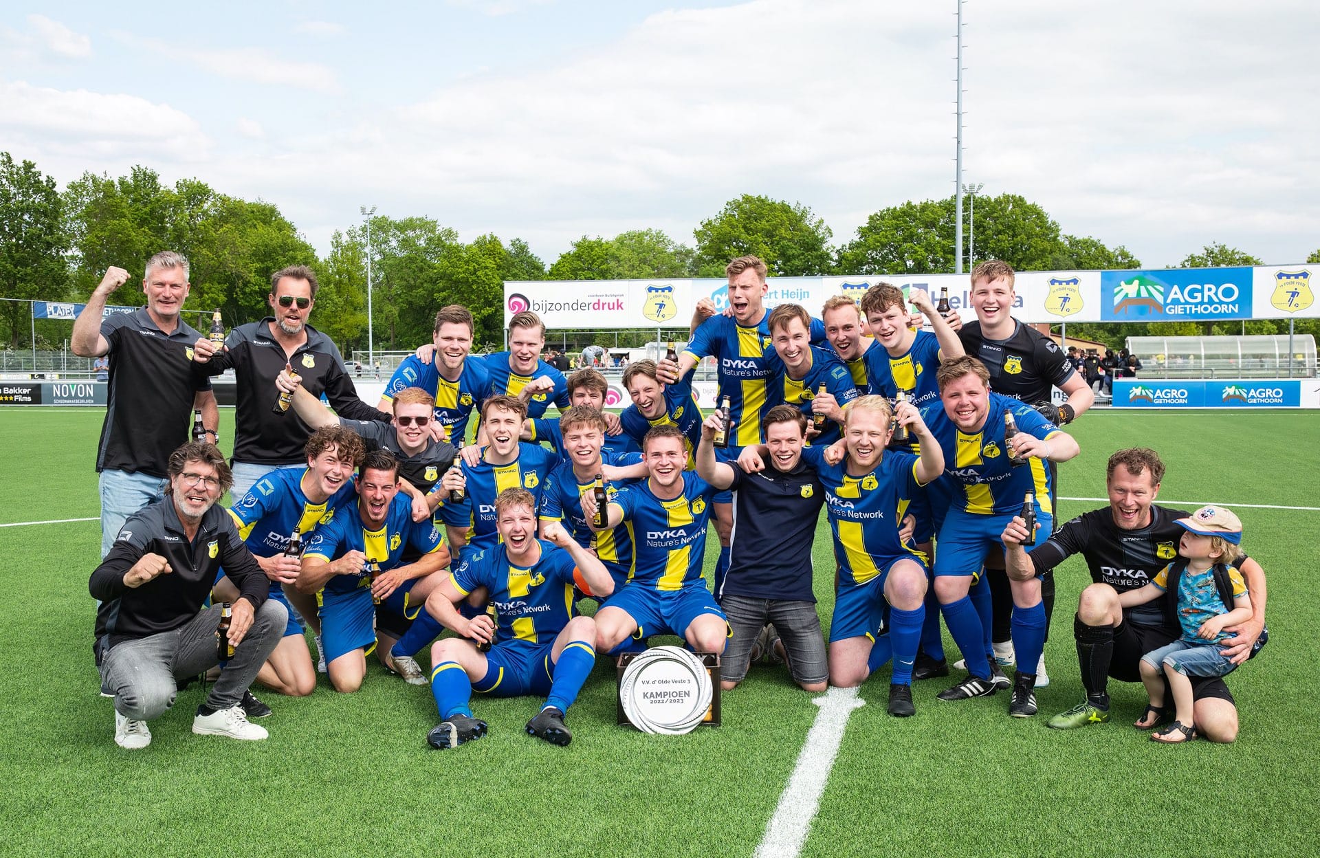 Voor de tweede keer in het voetbaljaar 22/23 mochten de kurken van de champagneflessen. Na in het najaar al kampioen te zijn geworden in de 2e klasse werd het kunststukje zaterdag 19 mei nog eens herhaald. Een mooie 5-3 overwinning op het tweede elftal van Joure was de bekroning voor Olde Veste 3 op een super seizoen. Waar het in het najaar al tegen veel tweede elftallen voetbalde was dat in de voorjaarscompetitie niet anders. Onder andere Workum, Joure, Bolsward, Sneek Wit Zwart en Balk kwamen met hun tweede team als tegenstander naar de Parallelweg. Maar met elf overwinningen, één gelijkspel en één nederlaag was de ploeg van Roelof Lugtmeijer al niet meer te achterhalen voor de concurrentie. In de kampioenswedstrijd, die onder leiding stond van scheidsrechter Herman Greveling, tegen Joure liet OV 3 in het eerste half uur zien leuk voetbal op de mat te kunnen leggen. Grensrechter Raymond Coelingh hoefde zijn vlag in de eerste 30 minuten alleen te gebruiken als vreugdesignaal bij een treffer. Maar bij de vroege 3-0 dacht OV 3 dat het de buit al binnen had. Mede doordat (teammanager 2) Benno Hellinga al richting het clubgebouw vertrokken was om de kampioensshirts te strijken en Leon Boetze (teammanager 1) de champagneflessen al koud zette. Maar een overrompelde Friese tegenstander was het met de gang van zaken niet helemaal eens en schakelde een tandje bij en in een mum van tijd was de opgelopen achterstand terug gebracht naar 1 treffer. Olde Veste herstelde zich knap en toonde uiteindelijk via een 5-3 overwinning wie de terechte kampioen was.
