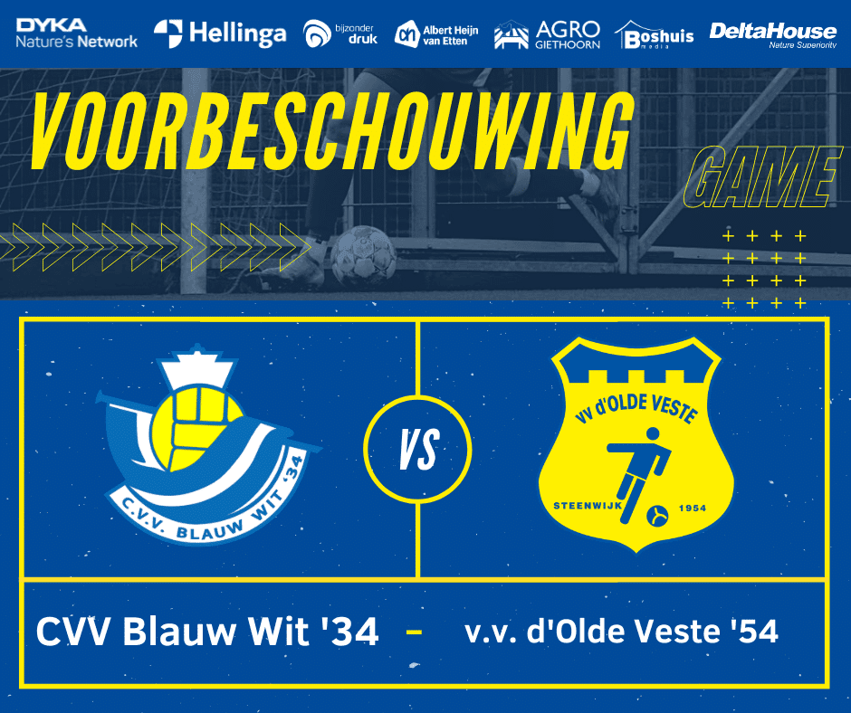 Maar dat kan na deze speelronde direct weer anders zijn. ONS Sneek speelt namelijk tegen medetitelkandidaat KHC Kampen (dat afgelopen week verrassend verloor van FC Burgum). Wijzelf spelen een uitwedstrijd tegen Blauw Wit ‘34. Met deze ploeg hebben we nog een appeltje te schillen. Want thuis hielden de Leeuwarders ons knap op 0-0. Momenteel bezetten de Blauw Witten de 7e plek van de ranglijst. Met zes overwinningen, zes verliespartijen en drie gelijke spelen, zijn de resultaten aardig in balans. Volgens de bekende statistieken zijn middenvelder Dion Rooze en aanvaller Bob Schepers met slechts vier goals de meest trefzekere spelers. Zal het de moeilijk scorende middenmoter lukken om onze verdediging te verslaan? En hoe houdt de Friese verdediging stand tegen onze aanvallers? De wedstrijd wordt geleid door scheidsrechter Agricola. Slag en Renkema zijn de assistenten.